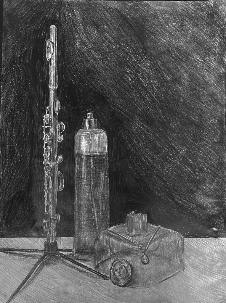 Delusions of Grandeur is a drawing made for my ARTS 115 class my freshman year of college. This project was focused on clear and reflective objects, so I chose to draw my mother’s piccolo, a bottle of perfume, jewelry, and a small mirror. This was the project that I was most proud of from my drawing class.
